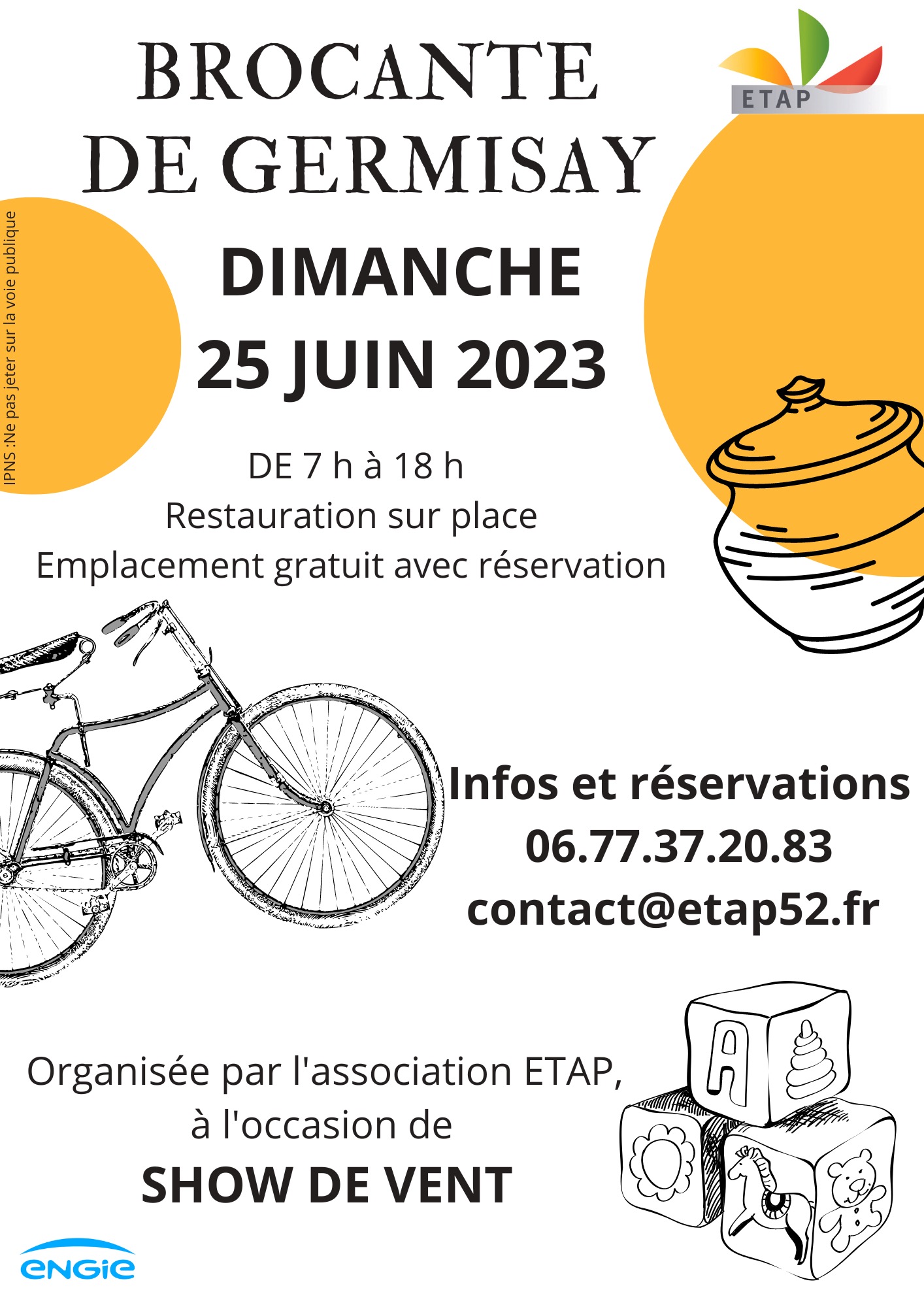 L'association ETAP vous attend à son prochain SHOW DE VENT couplé avec une brocante le dimanche 25 juin 2023 ! Cette manifestation se déroulera à Germisay.